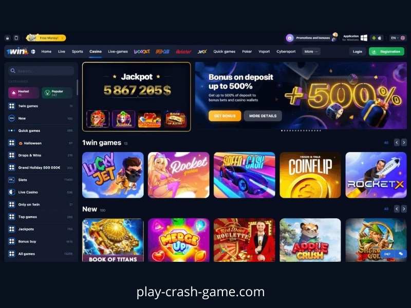 O 1Win é um popular sítio de apostas desportivas e de casino online disponível em muitos países. O 1Win é também um casino em linha onde se jogam vários jogos de apostas - Slots, jogos Crash, jogos ao vivo e jogos com prémios acumulados. A página inicial apresenta banners, botões para registar um perfil e iniciar sessão, e lista as categorias de jogos.
